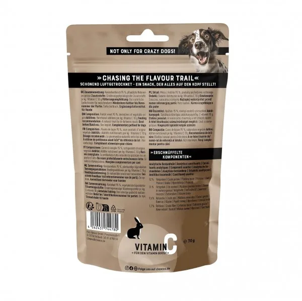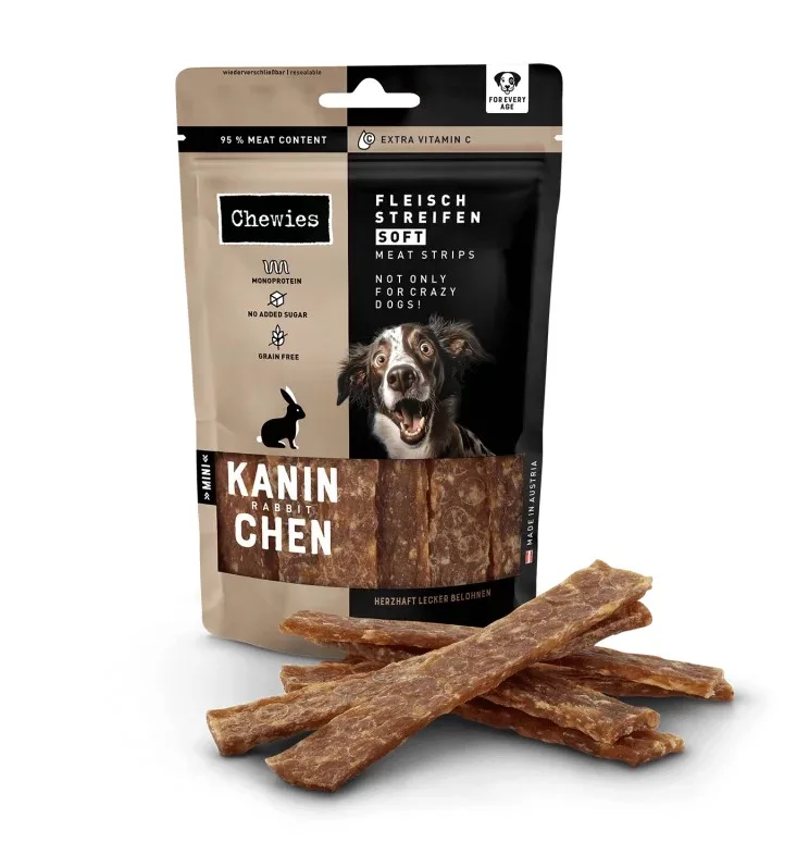 Twój pies pokocha Chewies® Paski Mięsne Soft Królik 150 g! Dzięki 95% delikatnie suszonego mięsa mają wyjątkowo intensywny smak i doskonale sprawdzają się zarówno jako codzienny smakołyk, jak i nagroda.