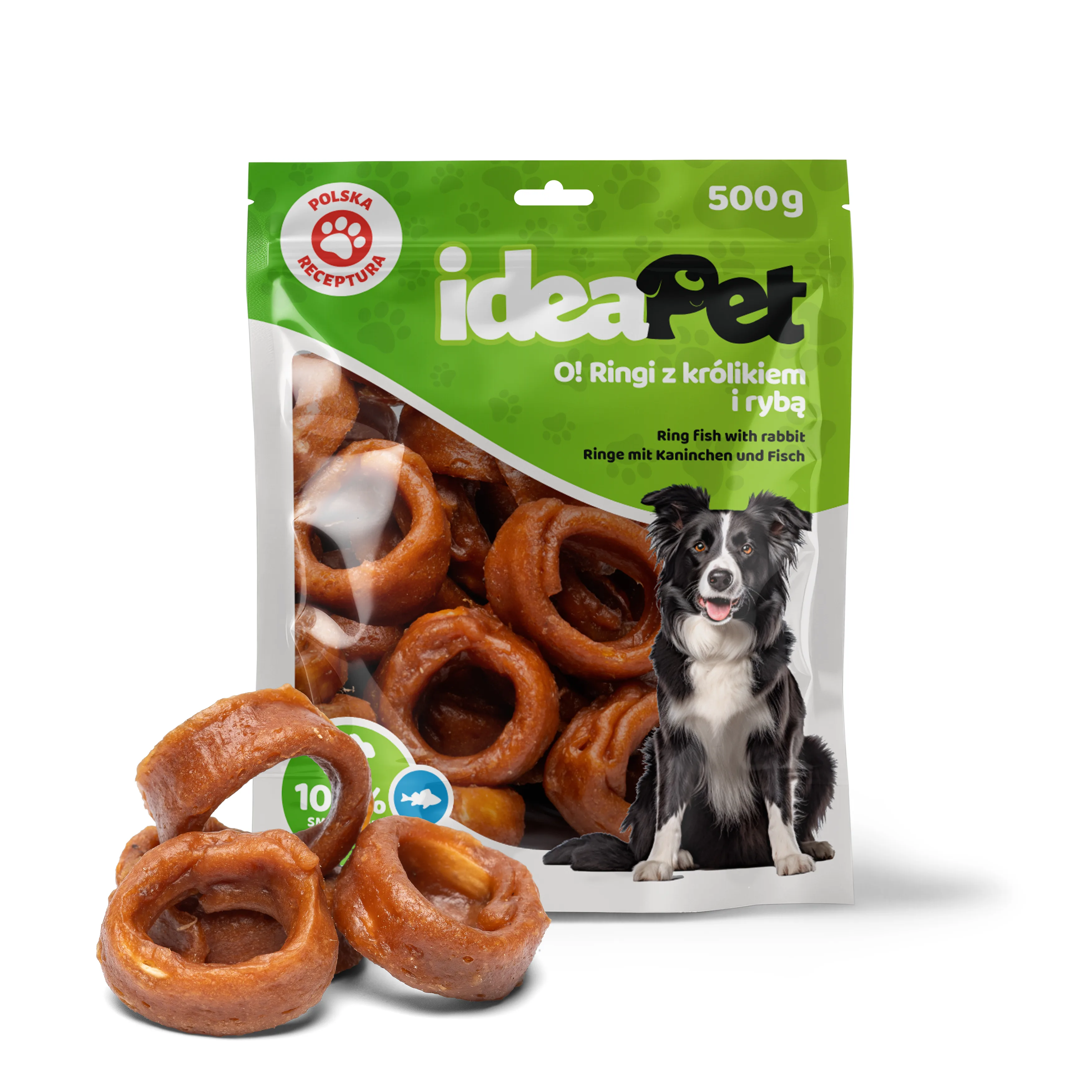 IdeaPet Ringi z królikiem i rybą to zdrowa przekąska w kształcie ringów, łącząca wysokiej jakości mięso z królika (30%), mięso z kaczki (25%) oraz rybę (30%). Mięso z królika jest lekkostrawne i hipoalergiczne, idealne dla psów z wrażliwościami pokarmowymi, podczas gdy ryba dostarcza cennych kwasów tłuszczowych omega-3 wspierających zdrowie skóry i sierści. Dzięki atrakcyjnemu kształtowi ringów, przysmak nie tylko smakuje, ale także dostarcza psu długotrwałej przyjemności żucia.