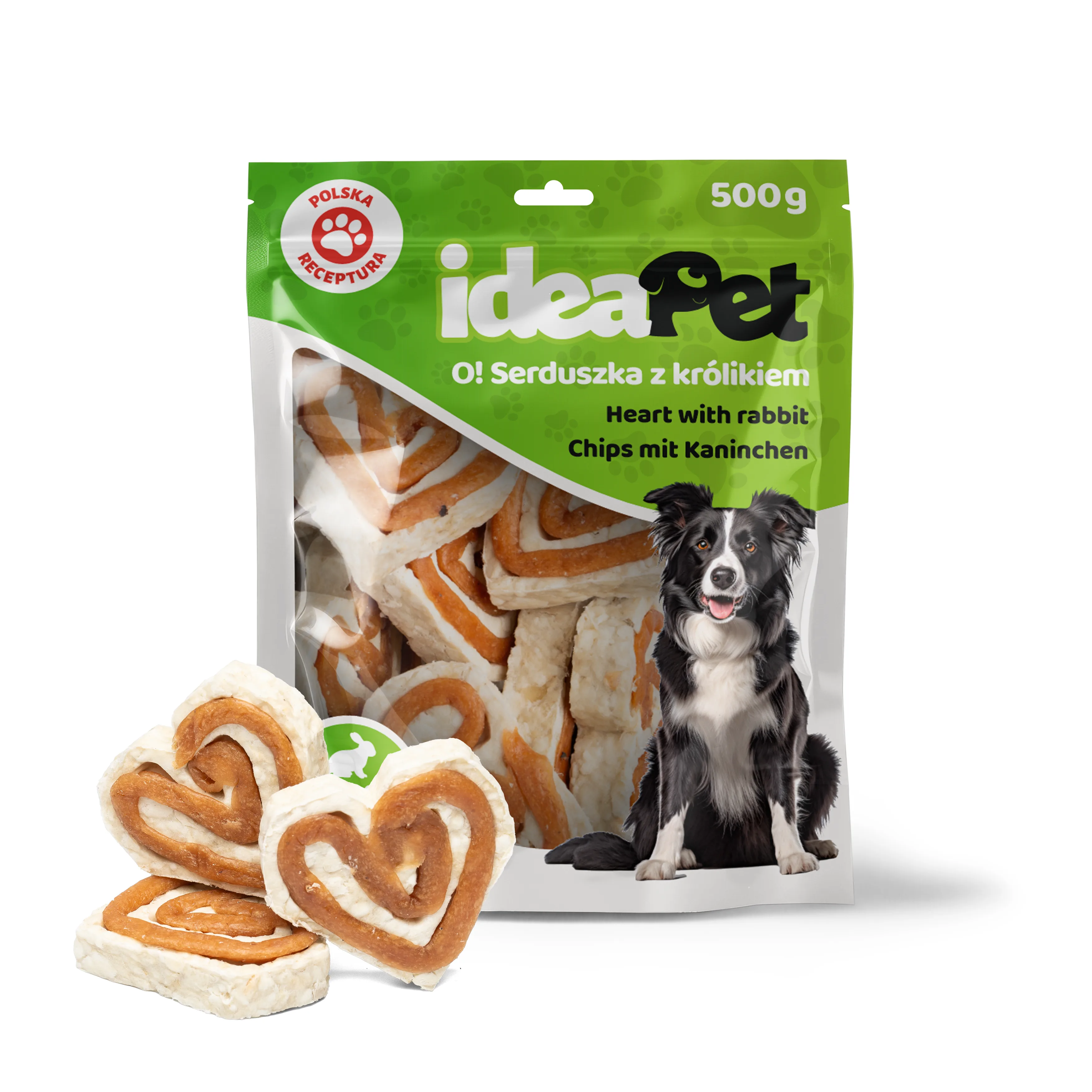IdeaPet Serduszka z królikiem to smaczna i zdrowa przekąska w kształcie serduszek, łącząca skórę wołową (55%) i mięso z królika (20%), idealna do żucia. Skóra wołowa pełni rolę naturalnego gryzaka, pomagając w utrzymaniu higieny jamy ustnej, a mięso z królika jest lekkostrawne i delikatne, co sprawia, że jest idealnym wyborem dla psów z wrażliwym układem pokarmowym. Przysmak zawiera również składniki pochodzące z wołowiny, które wzbogacają go o dodatkowy smak i wartość odżywczą. To doskonała przekąska dla psów, które uwielbiają zdrowe i smaczne gryzaki.