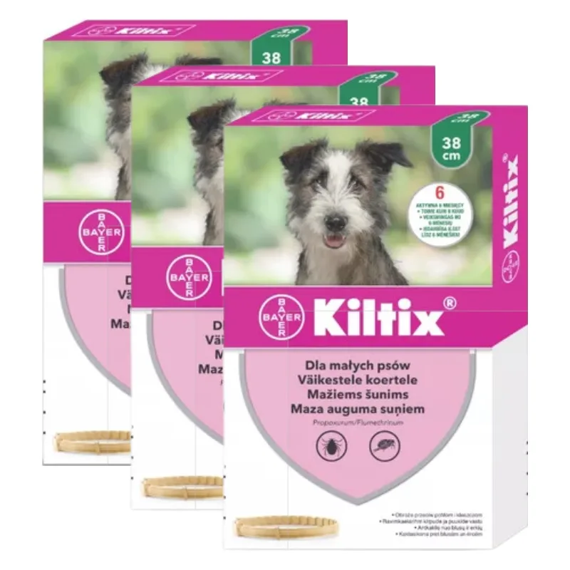 OstrzeżeniaNie stosować u psów chorych, z rozległymi zmianami skóry oraz będących w okresie rekonwalescencji.Przechowywać w miejscu niedostępnym dla dzieci. Podczas zakładania obroży unikać zbyt długiego kontaktu z preparatem. Po założeniu umyć dokładnie ręce. Osoby, u których wystąpiło uczulenie na składniki preparatu powinny unikać bezpośredniego z nim kontaktu. Małe dzieci i niemowlęta nie powinny mieć bezpośredniego kontaktu z psami noszącymi obrożę. Kiltix zawiera składniki toksyczne dla pszczół i ryb. Wyłącznie dla zwierząt.