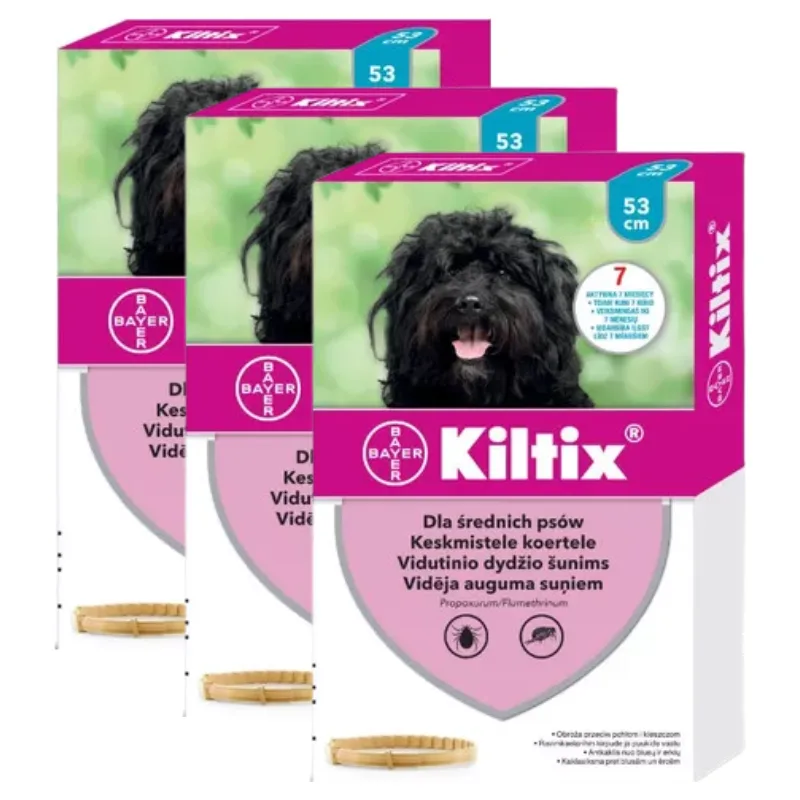 Dawkowanie i sposób podawania:Dla uzyskania optymalnego poziomu zabezpieczenia zaleca się wykąpać psa i następnie dokładnie go wysuszyć, po czym założyć obrożę. Obrożę należy wyjąć ze szczelnego opakowania, rozwinąć i usunąć plastikowe ograniczniki na gładkiej wewnętrznej stronie obroży, trzymając za końce kilkakrotnie lekko rozciągając dla ułatwienia wydostawania się substancji aktywnej, a następnie założyć luźno na szyi zwierzęcia przeciągając przez klamerkę. Obroża powinna być noszona stale z wyjątkiem kąpieli. Można ją założyć ponownie gdy sierść wyschnie. W pojedynczych przypadkach w czasie noszenia obroży możliwa jest inwazja kleszczy, które odpadają najpóźniej po trzech dniach bez ssania krwi. Obroża Kiltix przeznaczona jest wyłącznie do stosowania zewnętrznego.