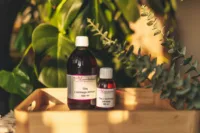 Butelki z olejem Lunderland z dzikiego mintaja (500 ml i 90 ml) na drewnianej tacy, w tle rośliny.