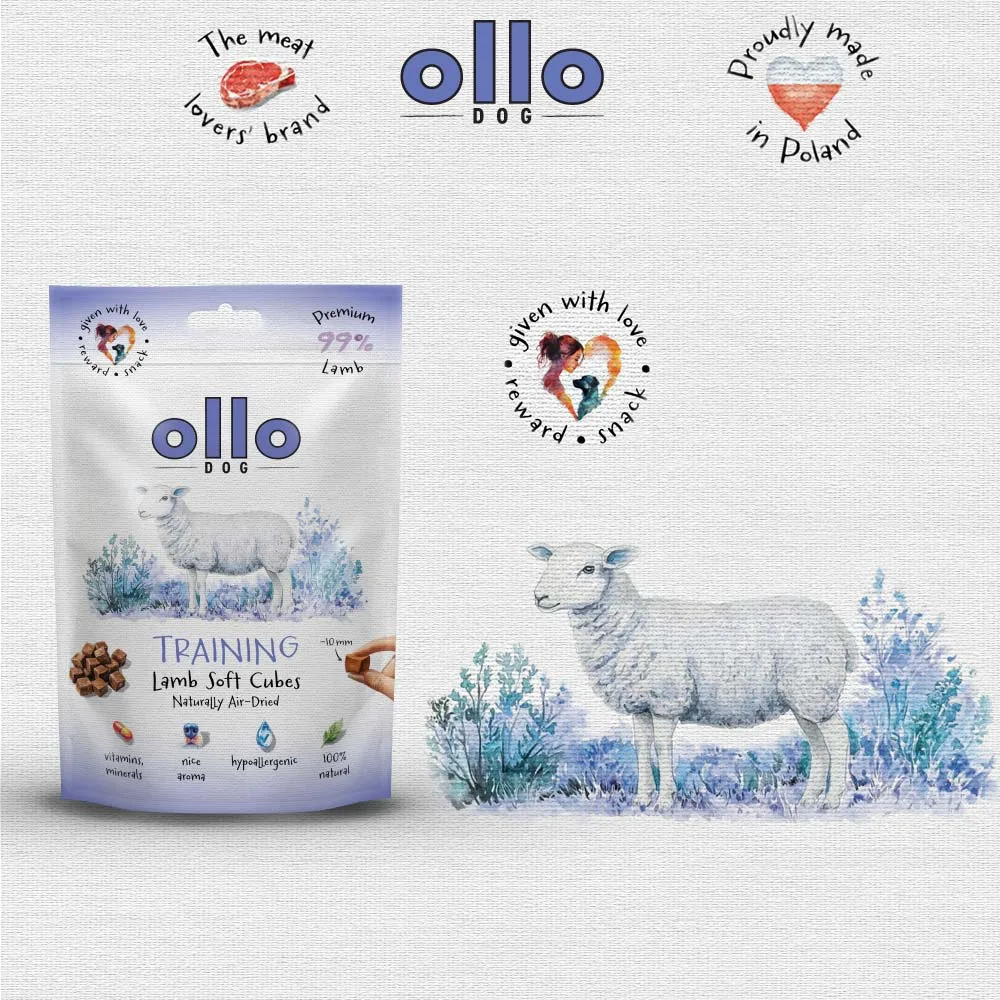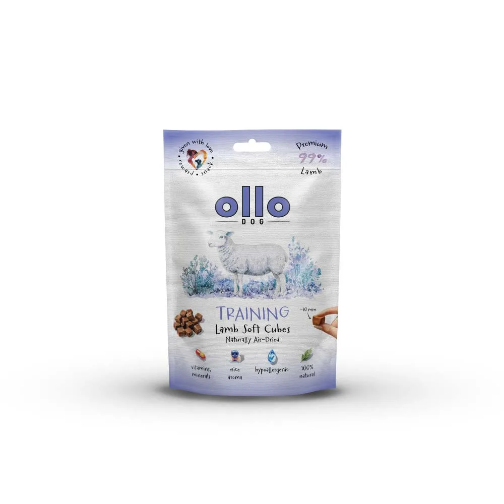 Przysmaki dla psa Ollo Air-Dried Training Lamb Soft Cubes to naturalne, hipoalergiczne, monobiałkowe smaczki z jagnięciny. Są delikatnie suszone powietrzem. W kształcie kostek o wymiarach ok 10 mm. W 100% naturalny produkt, stworzony z myślą o psach wszystkich ras i w każdym wieku. Są miękkie i monobiałkowe, co jest niezwykle istotne dla psów z alergiami pokarmowymi oraz tych z wrażliwym żołądkiem.
