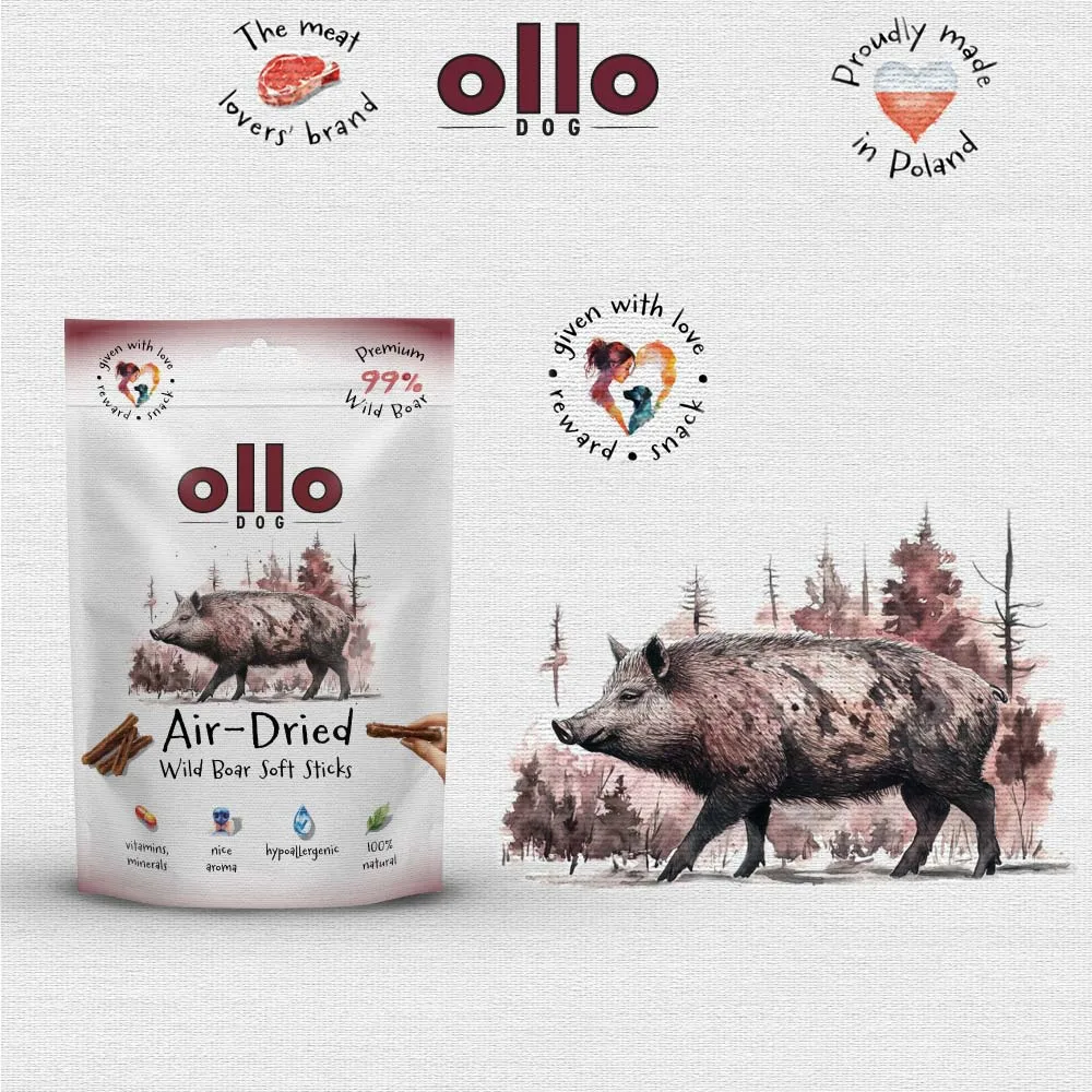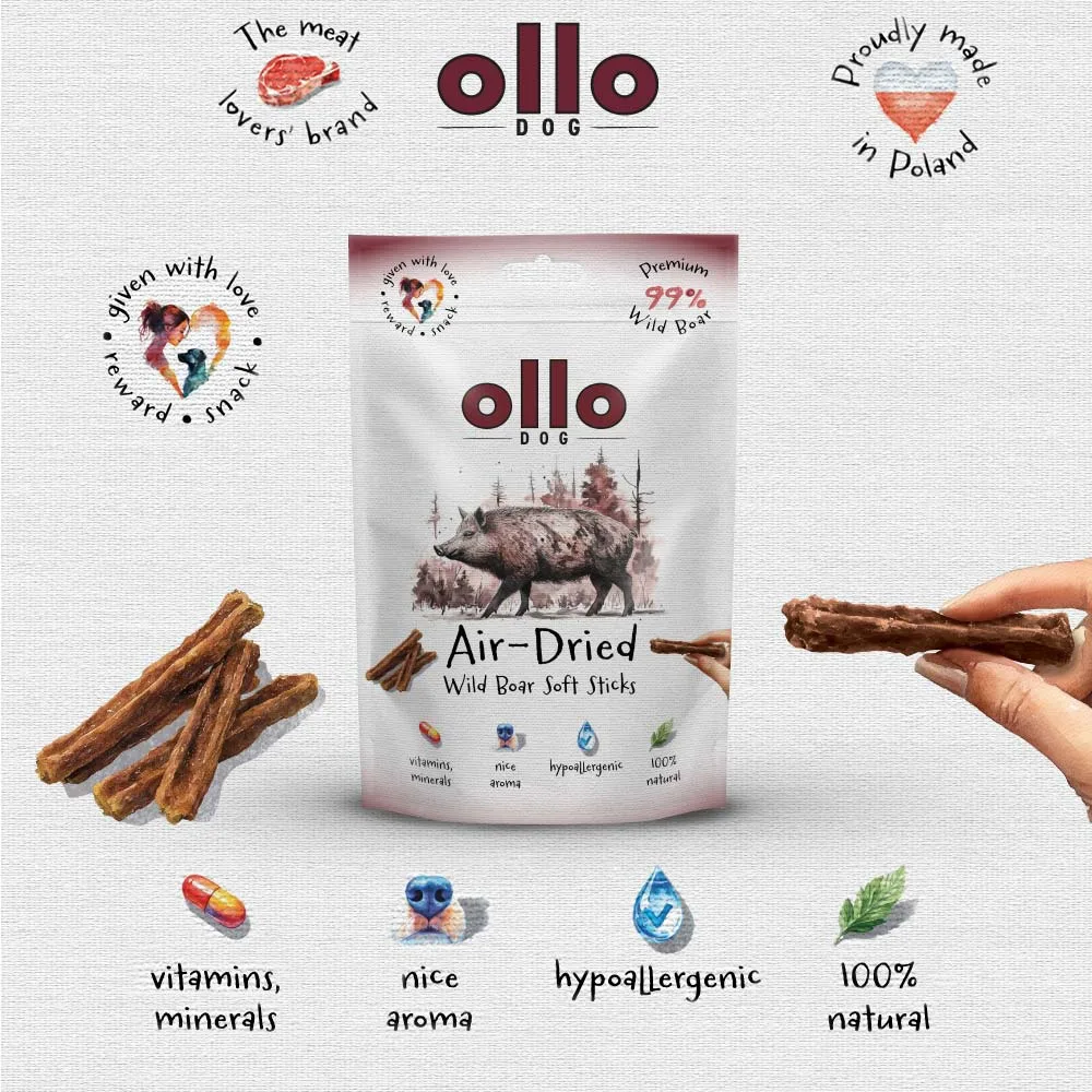 Przysmaki dla psa Ollo Air-Dried Wild Boar Soft Sticks to naturalne, hipoalergiczne, monobiałkowe smaczki z dzika. Są delikatnie suszone powietrzem. W kształcie pałeczek. W 100% naturalny produkt, stworzony z myślą o psach wszystkich ras i w każdym wieku. Są miękkie i monobiałkowe, co jest niezwykle istotne dla psów z alergiami pokarmowymi oraz tych z wrażliwym żołądkiem.