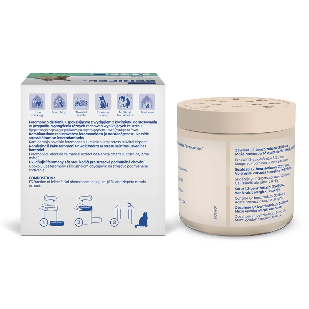 Koty naturalnie wydzielają różne feromony w odpowiedzi na różne sytuacje – przykładem są kocie feromony policzkowe (FFP), wydzielane przez gruczoły na policzkach i brodzie. Koty pocierają nimi przedmioty, aby oznaczyć je jako bezpieczne i znane. Zenifel zawiera syntetyczne feromony, które naśladują FFP, a także kocimiętkę, która przyciąga uwagę Twojego pupila. Gdy koty wyczuwają tę mieszankę w powietrzu, wiedzą, że miejsce jest bezpieczne i mogą się zrelaksować. Badania wykazały, że produkt redukuje zachowania wywołane stresem nawet o 80%.